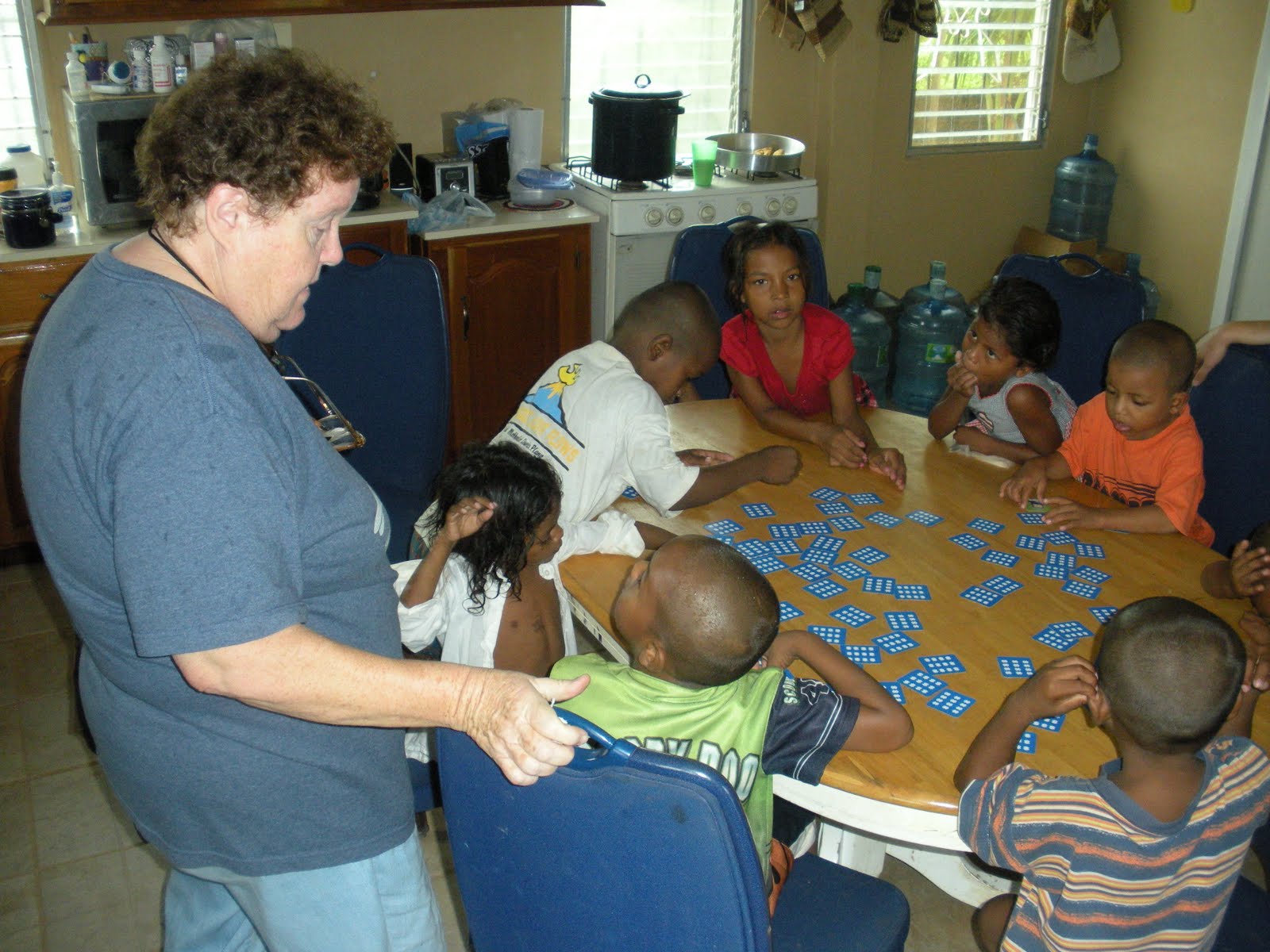 And below is Charlotte supervising a game of "memory." It started out organized but quickly became mass confusion. They had fun, and Charlotte tried her best to keep the game going smoothly. I'm pretty sure we did NOT end up with all the pieces going back into the box. Oh well! This picture is taken in the kitchen area of the guest house. Over the past couple of years, the guest house was constructed by our group and other groups to house the volunteers. Before it was completed, we would sleep in the dorm with the kids at the main house. Let me tell you, it is a whole new world having your own bed in a separate house! The guest house has 4 bedrooms, 3 1/2 baths and sleeps up to 18 in bunk beds.